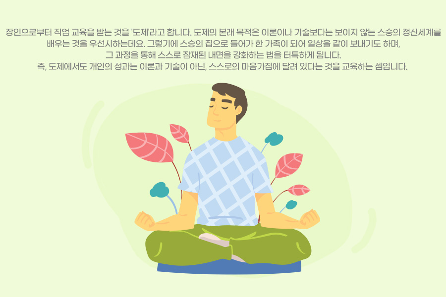 장인으로부터 직업 교육을 받는 것을 '도제'라고 합니다. 도제의 본래 목적은 이론이나 기술보다는 보이지 않는 스승의 정신세계를 배우는 것을 우선시하는데요. 그렇기에 스승의 집으로 들어가 한 가족이 되어 일상을 같이 보내기도 하며, 그 과정을 통해 스스로 잠재된 내면을 강화하는 법을 터특하게 됩니다. 즉, 도제에서도 개인의 성과는 이론과 기술이 아닌, 스스로의 마음가짐에 달려 있다는 것을 교육하는 셈입니다.