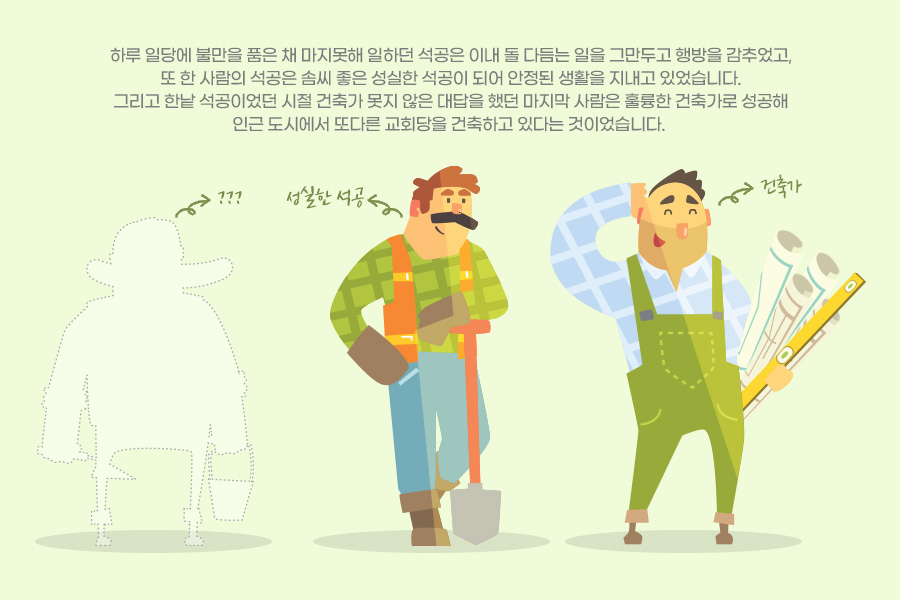 이 이야기는 마음가짐이 필연을 만든다는 교훈을 담고 있습니다. “이 돌들이 모여 가장 아름다운 교회당이 생긴다는 것 아닙니까” 하며 의욕에 찬 그의 일하는 모습과 마음가짐이 석공을 뛰어넘어 건축가로서의 삶을 만든 것입니다.