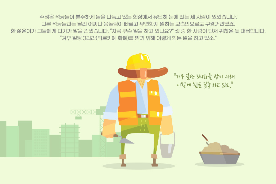 수많은 석공들이 분주하게 돌을 다듬고 있는 현장에서 유난히 눈에 띄는 세 사람이 있었습니다. 다른 석공들과는 달리 어찌나 몸놀림이 빠르고 유연한지 일하는 모습만으로도 구경거리였죠. 한 젊은이가 그들에게 다가가 말을 건냈습니다. “지금 무슨 일을 하고 있나요?” 셋 중 한 사람이 먼저 귀찮은 듯 대답합니다. “겨우 일당 3리라(튀르키예 화폐)를 받기 위해 이렇게 힘든 일을 하고 있소.”