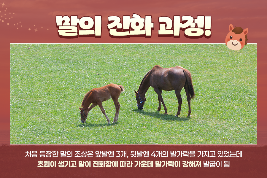말이 처음부터 지금처럼 큰 몸집을 가지고 있었던 것은 아니라는 사실, 알고 계셨나요? 지구상에 등장한 말의 조상은 약 5,500만 년 전 동물인 히라코테리움(Eohippus)으로, 크기는 강아지 정도에 불과했습니다. 이 동물은 앞발엔 3개, 뒷발에는 4개의 발가락을 가지고 있었는데요.
