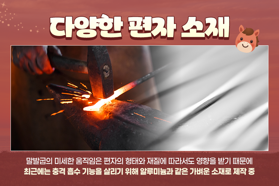그래서 최근에는 발굽의 충격 흡수 기능을 최대한 살리기 위해 알루미늄이나 합성수지 같은 가벼운 소재, 또는 발굽의 확장을 고려한 구조의 편자도 사용하는 추세인데요. 말이 어떤 환경에서 얼마나 자주 달리는지에 따라 편자의 선택이 달라지는 이유이기도 하죠!