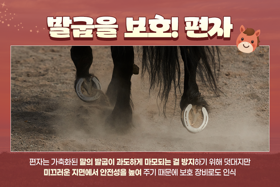 이러한 환경에서는 발굽의 바깥층이 갈라지거나 닳아 내부 조직에 부담을 주어 부상 위험이 커지기 때문에 편자를 덧대어 보호합니다. 편자는 금속으로 된 U자형 구조로, 발굽의 마모와 파손을 줄이고 충격을 분산하는 역할을 하는데요. 미끄러운 지면에서도 안전성을 높여 주기 때문에, 특히 경주마나 작업마처럼 발굽 마모 속도가 빠른 말들에게 중요한 보호 장비로 사용됩니다.