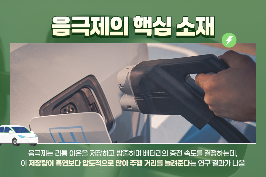 전기차 배터리는 어떤 소재로 만들어질까요? 전기차에 가장 많이 쓰이는 리튬이온 배터리에는 ‘음극재’라는 핵심 소재가 들어갑니다.