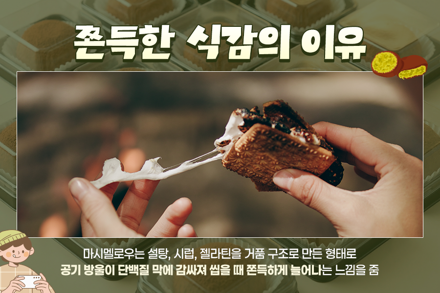 두바이쫀득쿠키의 핵심 식감은 마시멜로우에서 나오는데요. 마시멜로우는 설탕, 시럽, 젤라틴을 섞어 만든 거품 구조 식품으로, 공기 방울이 단백질 막에 감싸진 형태라 씹을 때 늘어나는 느낌을 줍니다.