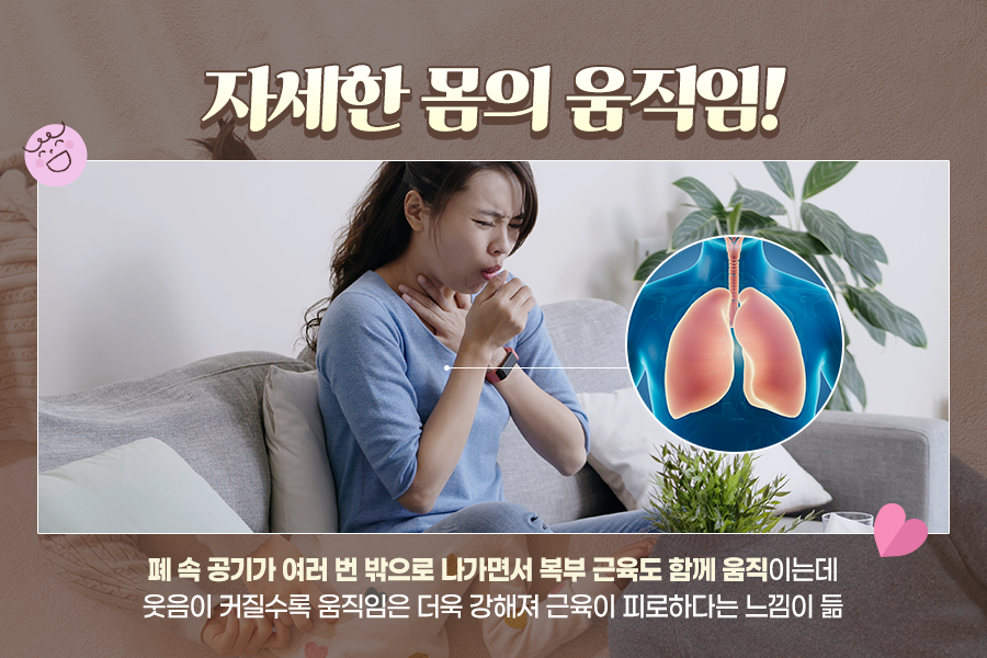 그래서 웃을 때 몸이 들썩이거나 앞으로 숙여지는 모습이 보입니다. 웃음이 커질수록 이런 움직임은 더욱 강해지는데요. 그래서 일부 근육이 피로하다는 느낌이 들 수 있습니다.