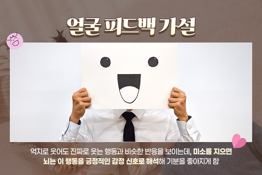 흥미로운 사실은 우리가 억지로 웃어도 진짜로 웃는 행동과 비슷한 반응을 보인다는 것입니다. 웃을 때 얼굴 근육을 움직인다면 뇌는 이 행동을 긍정적인 감정 신호로 해석한다고 하는데요. 이를 얼굴 피드백 가설이라고 합니다.