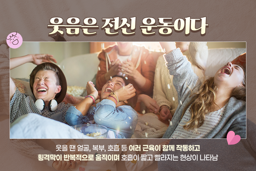 이처럼 웃음은 단순한 감정 표현이 아니라 우리 몸에서 다양한 반응을 일으키는 활동인데요. 그 과정에서 우리 몸은 가벼운 운동을 한 것처럼 에너지도 사용하게 되죠!