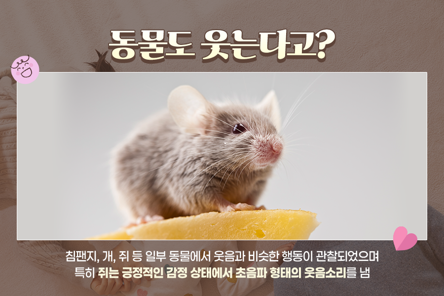 그렇다면 동물도 인간처럼 웃음이 있을까요? 신기하게 동물에게도 웃음과 비슷한 반응이 존재한다고 하는데요. 침팬지, 개, 쥐 등 일부 동물에서 웃음과 비슷한 행동이 관찰되었습니다. 특히 쥐는 간지럼을 태우면 초음파 형태의 웃음소리를 내기도 하는데요.