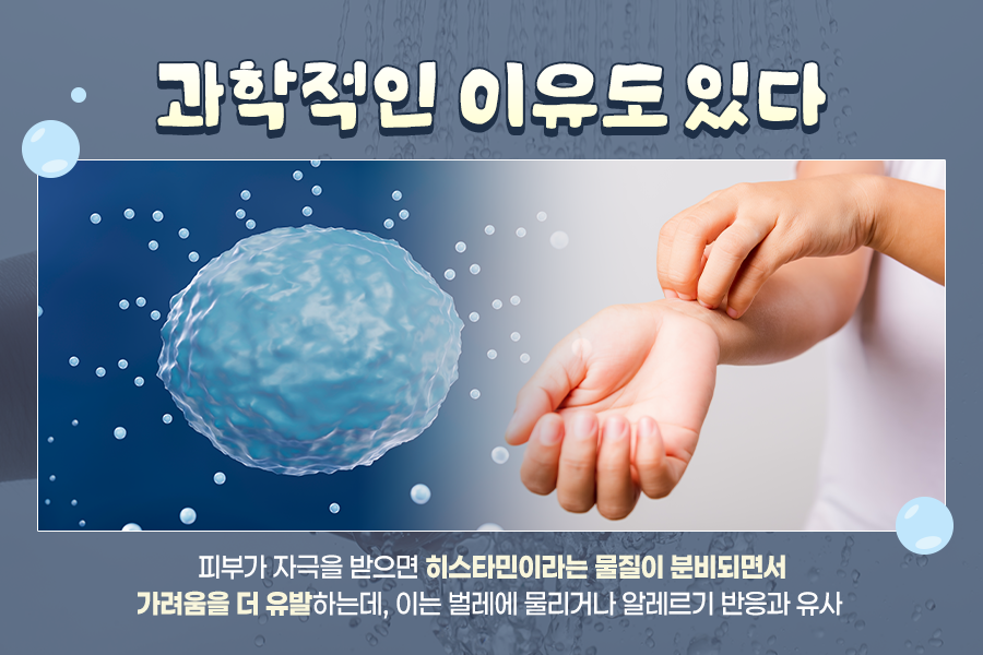 피부가 자극을 받으면 히스타민이라는 물질이 분비되면서 가려움을 유발하게 되는데요. 이는 벌레에 물리거나 알레르기 반응이 올라왔을 때와 비슷한 반응을 보입니다. 이 반응이 심해지면 실제로 피부가 붉어지거나 따끔거리는 느낌이 들죠.