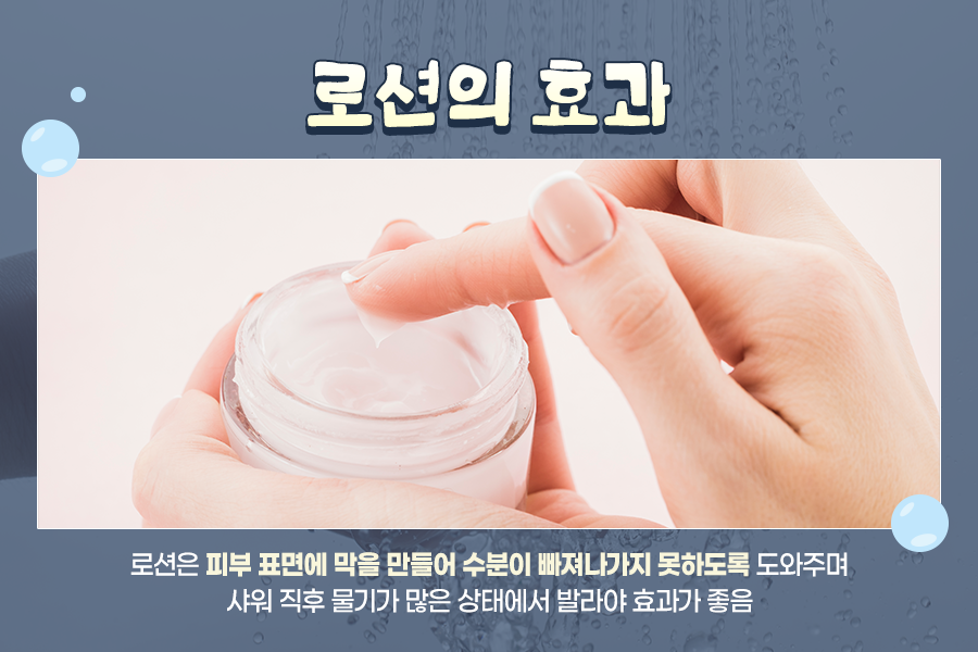 그래서 대부분의 사람들은 샤워 후 바로 로션이나 수분크림으로 수분을 보충해주곤 하는데요. 하지만 로션의 역할은 수분을 보충해주는 것과는 조금 다릅니다. 로션은 피부 표면에 막을 만들어 수분이 더 이상 빠져나가지 않도록 도와주는 역할에 더 가까운데요.