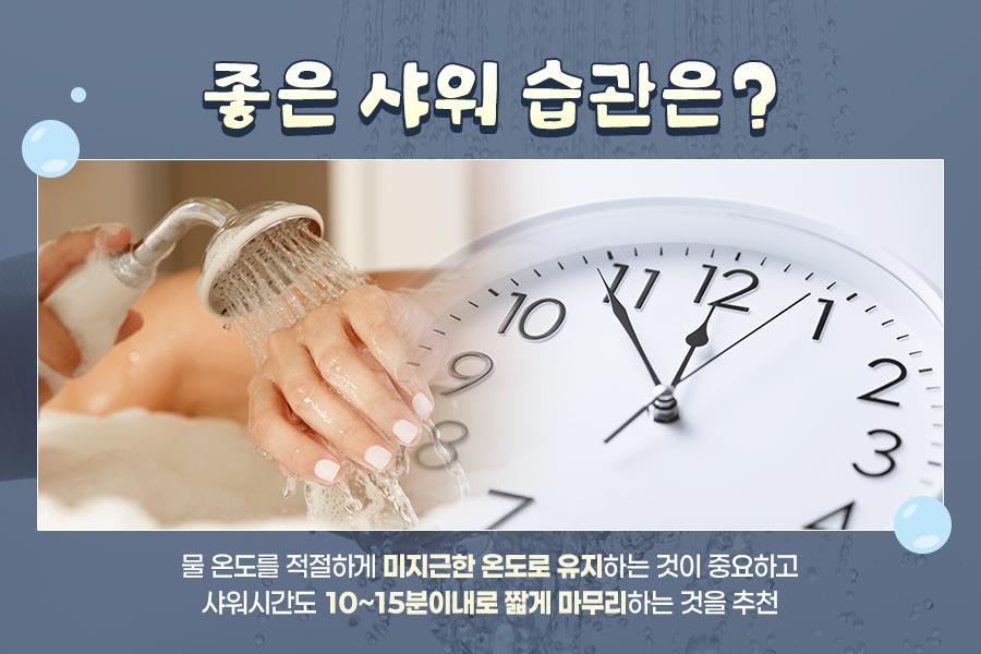 샤워 시간도 길게 끌기보다는 10~15분 이내로 짧게 마무리하는 것이 좋으며, 후에는 수건으로 세게 문지르기보다는 가볍게 두드리듯 물기를 제거해 자극을 최소화하는 것이 좋습니다.