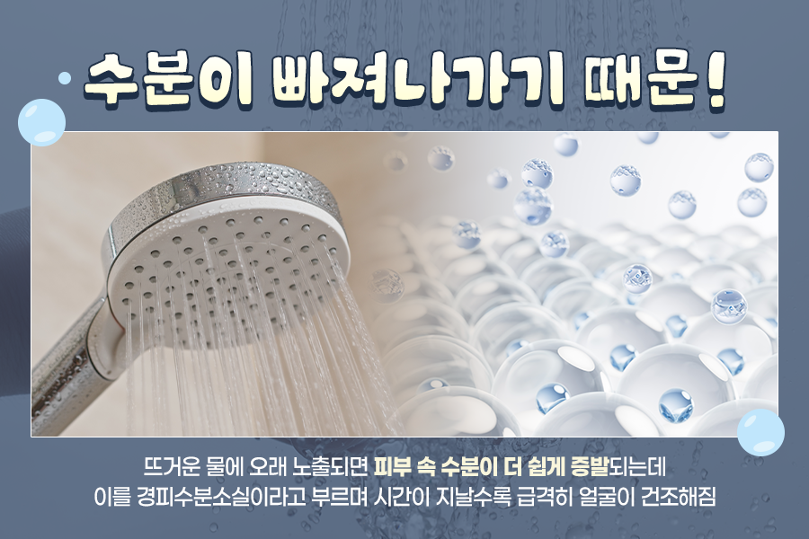 왜 이런 현상이 생기는 걸까요? 샤워를 하면 피부가 촉촉해진다고 생각하기 쉽지만, 사실은 반대입니다. 뜨거운 물에 오래 노출되면 피부 속 수분이 더 쉽게 증발하는 상태가 되는데요. 이를 경피수분손실이라고 하며 온도가 높을수록 이 현상이 더 심해집니다.