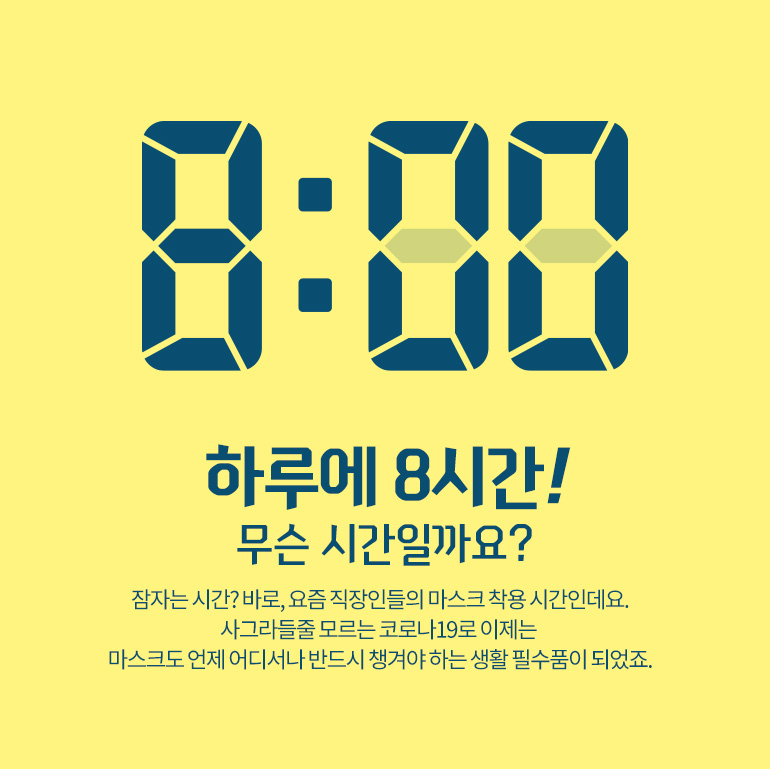 하루 8시간 이상. 무슨 시간일까요? 잠자는 시간? 바로, 요즘 직장인들의 마스크 착용 시간인데요.