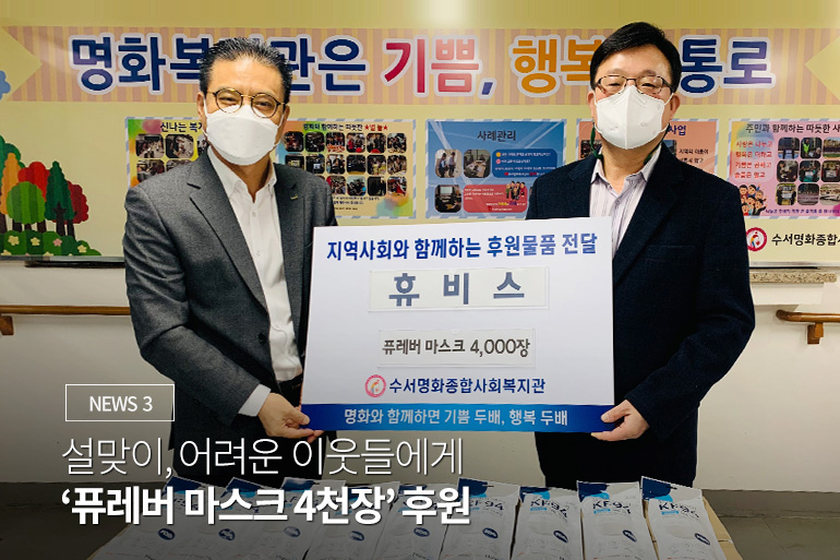 2월 4일, 2009년부터 후원해 온 수서명화복지원에 '퓨레버 마스크' 4천장을 기부한 것인데요.