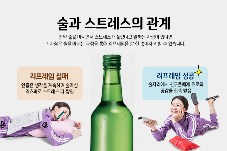 술은 뇌의 쾌락 중추에 작용해서 기분을 좋게 만들어 줄 수 있죠. 그러나 술기운이 사라지고 나서 스트레스 상황을 떠올렸을 때 어떤 감정이 생기는가가 중요합니다. 만일 술 마시기 전과 동일한 나쁜 감정이 든다면 그것은 스트레스가 풀린 게 아니고 그냥 잠시 잊고 있었던 거죠.