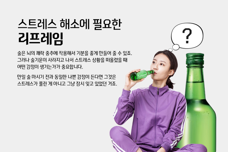 이것은 스트레스를 푸는데 꼭 필요한 건 술이 아니라는 이야기가 될 수 있습니다. 앞서 말했듯이 스트레스 해소에 필요한 건 리프레임이고 이는 친구나 가족과 함께 차를 마시며 대화를 통해서도 가능하고 또는 혼자만의 시간으로도 가능합니다. 자신의 감정을 살피고 스스로 리프레임을 만들어 내는 게 스트레스를 해소하는 과정이기 때문이죠.