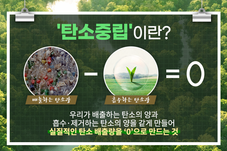 우리가 편리함을 위해 사용하는 일회용품과 화석 연료 등은 탄소 배출의 주요 원인으로 손꼽히고 있는데요. 탄소 배출이 증가함에 따라 심각한 기후 변화가 발생해 폭염과 한파, 미세먼지, 가뭄 등의 자연재해가 날로 늘어나는 추세입니다. 기후변화로 인한 더 이상의 피해를 막고자 전 세계적으로 탄소 배출량을 줄이려는 움직임이 이어지고 있는데요. 우리나라도 이에 동참하고자 지난해 10월, ‘2050 탄소중립’을 선언했죠. 과연 ‘탄소중립’은 무엇일까요? 우리는 이를 위해 무엇을 할 수 있을지 알아보겠습니다!
