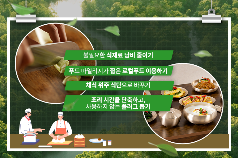 1kg의 고기가 우리 식탁에 오르기 위해 가축에게 30kg이 넘는 콩과 곡물을 소비해야 합니다. 일주일에 한두 번은 채식 위주의 식단을 구성하면 탄소 배출 감소에 많은 도움이 될 수 있습니다. 또한 조리 시간을 단축하면 에너지를 사용을 줄일 수 있는데요~ 재료는 가급적 작게 썰고, 냄비 뚜껑을 닫고 조리하는 것이 좋습니다.