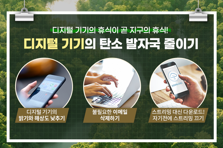 스마트폰 사용과 탄소 배출, 언뜻 생각하기엔 큰 연관성이 없어 보이죠. 하지만 스마트폰 데이터를 연결하는 데이터 센터의 온도와 습도를 유지하고, 서버를 냉각하기 위해서는 많은 양의 전력이 소모되어 탄소 배출에 악영향을 미치는데요. 따라서 컴퓨터나 스마트폰을 사용할 때는 해상도와 밝기를 낮추고, 휴식 중에는 절전 모드를 활용하는 것이 좋습니다.