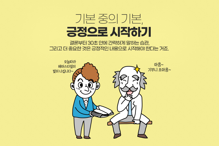 회사에서는 말을 길게 할 경우 듣지 않습니다. 게다가 부정적인 서두에는 이미 마음이 닫힙니다. 그래서 꼭 지켜야 할 2가지! 결론부터 30초 안에 간략하게 말하는 습관, 그리고 더 중요한 것은 긍정적인 내용으로 시작해야 한다는 거죠. 직장인들은 업무 시간 대부분 신경이 곤두서고, 이해관계가 얽혀있기 때문에 부정적인 이야기에는 거부감이 생깁니다. 상대가 반감이 생기면 나에게 불리하다는 뜻이죠.