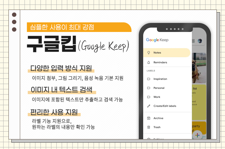 ‘구글킵’은 모든 운영체제와 동기화 가능한 메모 앱으로 기능 및 사용법이 매우 심플해 복잡한 메모 앱 사용이 어려운 분들에게 적합합니다. 이미지 첨부, 그림 그리기, 음성 녹음은 기본! 이미지 내의 텍스트를 검색할 수 있어 더욱 유용하죠. 라벨(태그와 비슷한 용도)을 달아주면 원하는 라벨만 모아서 확인할 수 있어 활용도가 높습니다. 또 하나, 크롬브라우저를 이용한다면 크롬 확장프로그램 설치로 더욱 편리하게 사용할 수 있다는 장점도 있습니다.