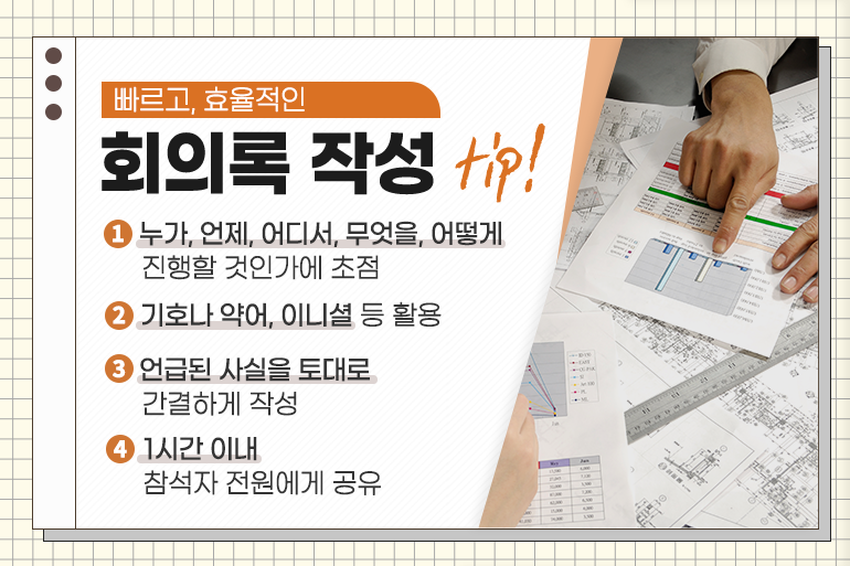 회의록을 쓸 때는 5W(WHEN, WHERE, WHO, WHAT, HOW)를 기억하면 쉽습니다. 누가, 언제, 어디서, 무엇을, 어떻게 진행할 것인지에 초점을 맞추어 작성하면 간단합니다. 미리 기본 양식을 정리해두고, 기호나 약어, 이니셜 등을 활용하면 빠른 작성에 도움이 됩니다. 회의 중 언급된 사실만을 토대로 최대한 간결하게 작성해야 하며, 작성자의 의견은 배제하는 것이 좋습니다. 또한 회의록은 가급적 1시간 이내에 참석자 전원에게 공유해야 혼선을 막고, 업무 분배가 원활하게 진행될 수 있으니 빠른 정리가 중요합니다.