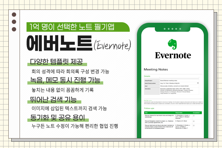 전 세계 1억 명 이상이 사용하는 노트 필기 앱 ‘에버노트’는 업무의 생산성과 효율성을 높여주어 직장인들에게 큰 사랑을 받고 있는데요. 다양한 템플릿을 제공해 회의 성격에 따라 회의록 구성을 달리할 수 있습니다. 또한, 녹음과 메모를 동시에 진행할 수 있어 놓치는 내용 없이 꼼꼼하게 기록할 수 있다는 것이 큰 장점!