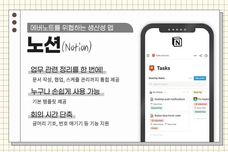 유료화된 ‘에버노트’를 대체할 앱으로 떠오른 생산성 앱 ‘노션’은 문서 작성이나 협업, 스케줄 관리 등을 한 번에 진행할 수 있어 용이합니다. 노션 안에서 관련 업무를 모두 진행할 수 있는 환경을 구축하기에, 지원하는 기능도 매우 강력합니다. 기본 템플릿을 제공해 문서 작성도 매우 간편합니다. 글머리 기호와 번호 매기기 등의 기능이 있어 회의록 작성 시간을 단축하고, 깔끔한 정리가 가능합니다.