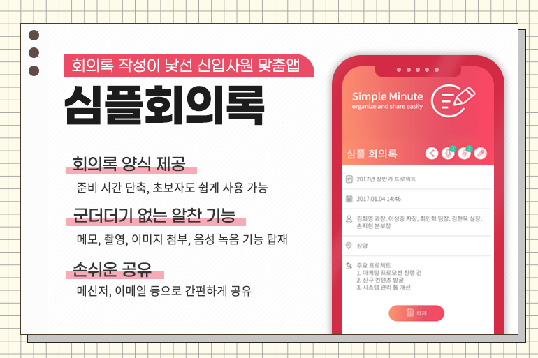 아직 회의록 작성이 어렵고, 낯선 신입사원들에게 자유로운 양식의 회의록은 부담스럽게 느껴질 수 있죠~ ‘심플회의록’은 기본적인 회의록 양식이 갖추어져 있어 준비 시간이 단축되고, 초보자도 쉽게 활용할 수 있습니다. 메모는 물론 사진 촬영이나 이미지 첨부, 녹음이 가능해 똑똑한 회의록 앱으로 불리는데요. 메신저나 이메일 등으로 손쉽게 공유도 가능하니 일잘러를 꿈꾸는 새내기 직장인들이라면 사용해보셔도 좋겠습니다!