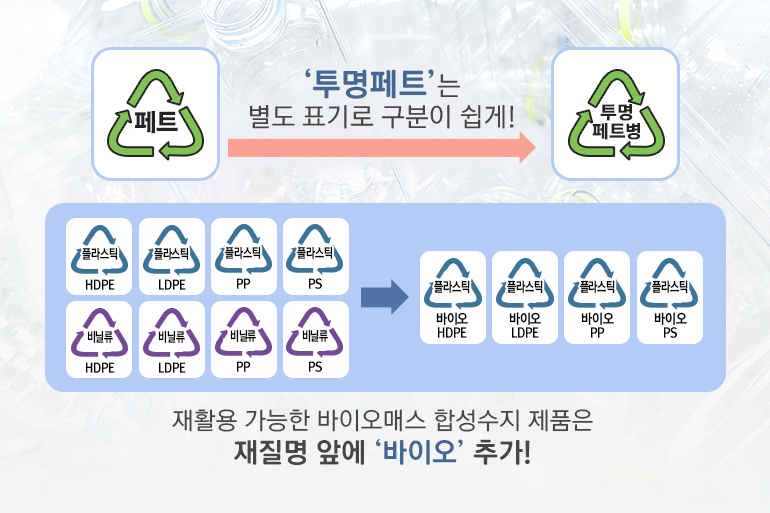 지난해부터 재활용 가치가 높은 투명 페트병은 일반 플라스틱과 구분해 분리배출하고 있는데요. 기존에는 모든 페트병을 ‘페트’로 표시해 배출 기준을 판별하기 어려웠죠. 하지만, 앞으로 ‘투명 페트’는 별도 표기가 생겨 배출 기준을 판단하기가 더욱 쉬워집니다. 또한 기존 플라스틱, 비닐류와 비슷한 성질을 가져 재활용이 가능한 바이오매스 합성수지 제품(바이오 플라스틱)은 재질명 앞에 ‘바이오’를 붙이게 됩니다. 비닐류 표시 재질(HDPE, LDPE, PP, PS)과 함께 분리배출이 가능하도록 ‘바이오 HDPE’, ‘바이오 LDPE’, ‘바이오 PP’, ‘바이오 PS’로 표시된다고 분리배출 할 때 꼭 기억하세요~