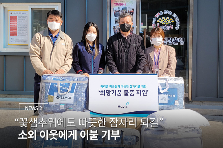 지난 25일, 휴비스는 전북지역 내 어려운 이웃들에게 꽃샘추위에도 따뜻하게 보내실 수 있도록 이불 세트를 전달하였습니다.