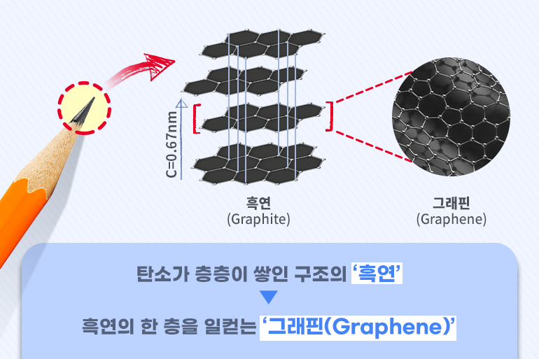 연필심으로 쓰이는 흑연 속에 ‘꿈의 물질’이라 불리는 신소재가 있다는 사실, 알고 계셨나요? 흑연은 탄소가 층층이 쌓인 구조인데 이 흑연의 한 층을 ‘그래핀(Graphene’)이라고 부릅니다. 이미 4~50년 전부터 물리학자들이 그래핀이 가진 무한한 가능성에 대해 이야기 해왔지만 그래핀을 추출하는 것이 쉽지 않았는데요. 그러다가 2004년, 영국 연구팀의 물리학자들이 스카치테이프로 흑연에서 그래핀을 최초로 분리하는 데 성공해 2010년 노벨 물리학상을 수상했습니다.
