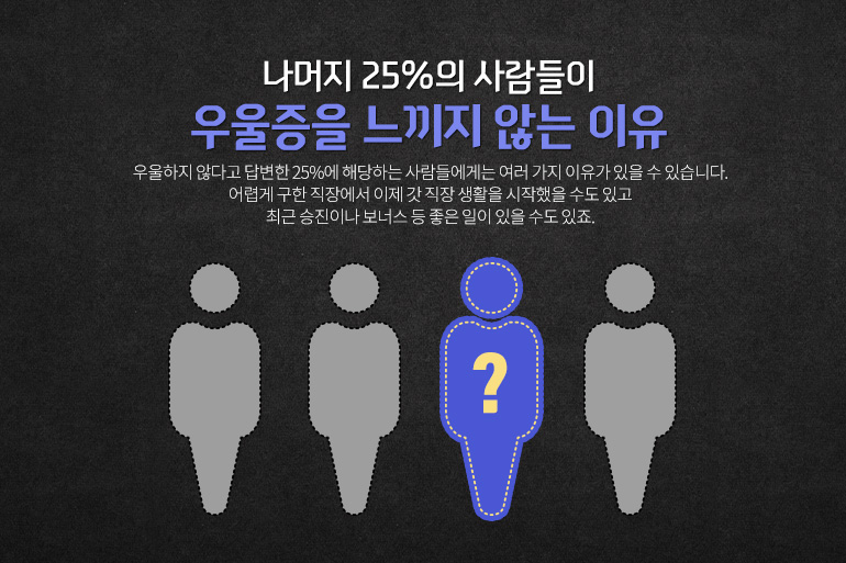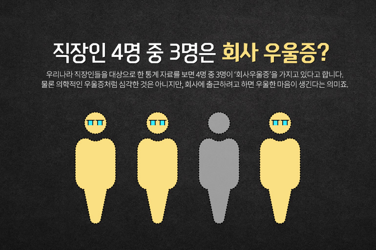 우리나라 직장인들을 대상으로 한 통계 자료를 보면 4명 중 3명이 ‘회사우울증’을 가지고 있다고 합니다. 물론 의학적인 우울증처럼 심각한 것은 아니지만, 회사에 출근하려고 하면 우울한 마음이 생긴다는 의미죠. 그런데 이 통계의 의미를 다시 한번 생각해보면 새로운 점을 발견할 수 있는데요. 4명 중 3명이 회사우울증이라면, 나머지 1명은 어떤 사람들일까요? 회사에서도 우울하지 않다고 답변 25%의 사람들은 어떤 특징을 가지고 있을까요?