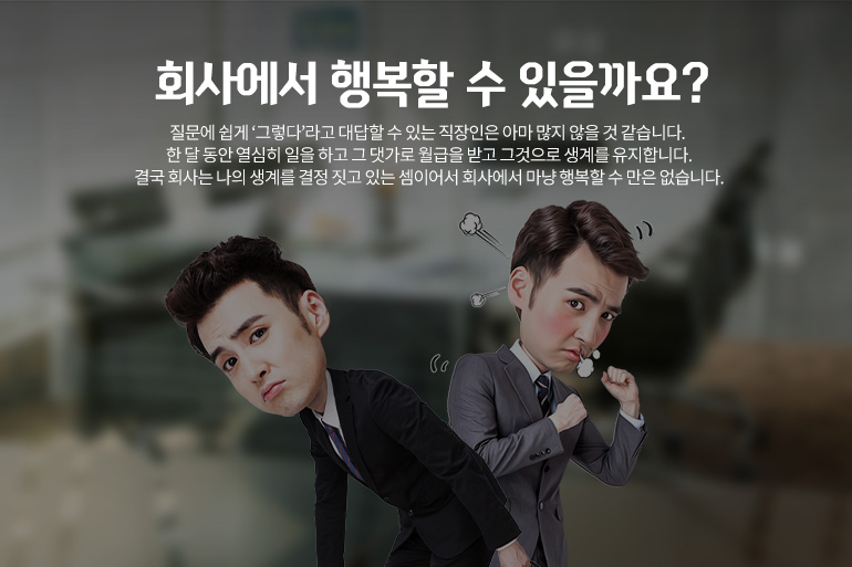 과연 회사에서 행복할 수 있을까요? 이러한 질문에 쉽게 ‘그렇다’라고 대답할 수 있는 직장인은 아마 많지 않을 것 같습니다. 직장인에게 회사는 삶의 터전이죠. 한 달 동안 열심히 일을 하고 그 댓가로 월급을 받고 그것으로 생계를 유지합니다. 결국 회사는 나의 생계를 결정 짓고 있는 셈이죠. 그래서 회사에서 마냥 행복할 수 만은 없습니다. 생계가 걸려 있으니 내가 하기 싫은 일도 해야 하고 어쩔 땐 힘에 부친 일도 맡아야 하며 성과도 내야 하죠. 그뿐 아니라 경쟁도 하게 됩니다. 긴장 속에서 일을 하게 되니 직장인에게 회사는 스트레스의 원인이 될 수 밖에 없습니다.