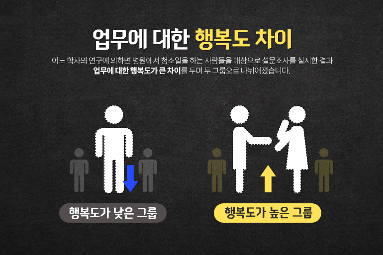 어느 학자의 연구에 의하면 병원에서 청소일을 하는 사람들을 대상으로 설문조사를 실시한 결과 업무에 대한 행복도가 큰 차이를 두며 두 그룹으로 나뉘어졌습니다.