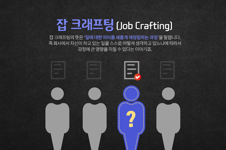 잡 크래프팅의 뜻은 ‘일에 대한 의미를 새롭게 재정립하는 과정’을 말합니다. 즉 회사에서 자신이 하고 있는 일을 스스로 어떻게 생각하고 있느냐에 따라서 감정에 큰 영향을 미칠 수 있다는 이야기죠.
