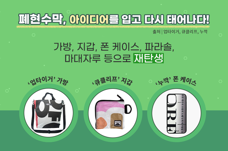 당장 현수막 사용을 멈출 수 없다면 폐현수막을 재활용하는 방법들을 찾아봐야겠죠. 다행히 기발한 아이디어로 폐현수막에 새로운 생명을 불어넣는 지자체와 친환경 기업들이 늘어나고 있는 추세입니다. ‘업타이거’, ‘큐클리프’, ‘누깍’ 등 업사이클 기업에서는 폐현수막을 활용해 감각적인 백팩, 에코백, 지갑, 핸드폰 케이스 등을 제작하고 있는데요~ 그외에도 폐현수막으로 시민을 위한 파라솔이나 개발도상국 아이들을 위한 신발을 제작하기도 하고 낙엽, 쓰레기 등을 담는 마대자루로 재활용하기도 하죠. 가정에서도 깨끗하게 세탁한 폐현수막을 에코백이나 앞치마 등으로 만들어 활용할 수 있으니 한 번 따라보는 것도 좋겠네요!