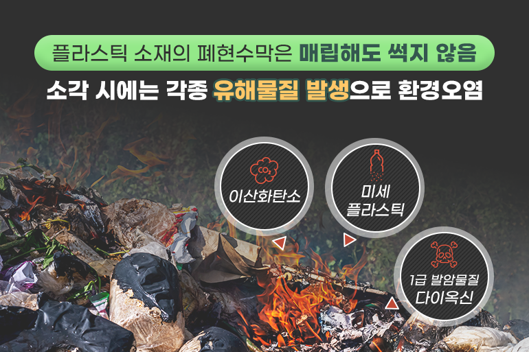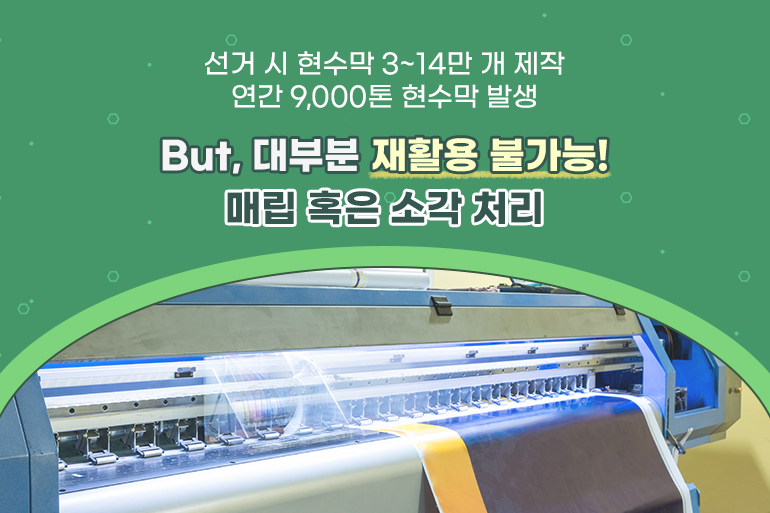 그렇다면 할 일을 끝낸 폐현수막들은 어디로 사라지는 걸까요? 안타깝게도 대부분은 재활용이 어렵기 때문에 매립 혹은 소각 처리를 하게 되는데요. 플라스틱 소재로 만들어진 현수막은 매립해도 썩지 않고, 소각할 경우 이산화탄소, 미세 플라스틱, 1급 발암물질인 다이옥신 등을 배출해 환경을 오염시킵니다. 문제는 선거철 이외에도 매년 9,000톤에 달하는 폐현수막이 발생하고 있지만 뚜렷한 대안이 없어 현수막 매립 및 소각으로 인한 환경오염 문제가 지속된다는 점이죠.