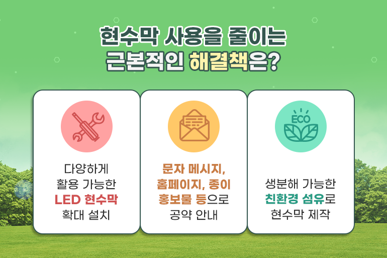 그동안 무심코 지나쳤던 현수막이지만 앞으로는 현수막을 볼 때마다 환경오염에 대한 걱정스러운 마음이 싹트기 시작할 거예요. 이러한 불편한 마음을 외면하지 마시고, 폐현수막을 비롯한 다양한 환경오염 문제들에 더욱 관심을 가지면서 우리가 할 수 있는 노력이 무엇인지 고민해 보시면 좋겠습니다.