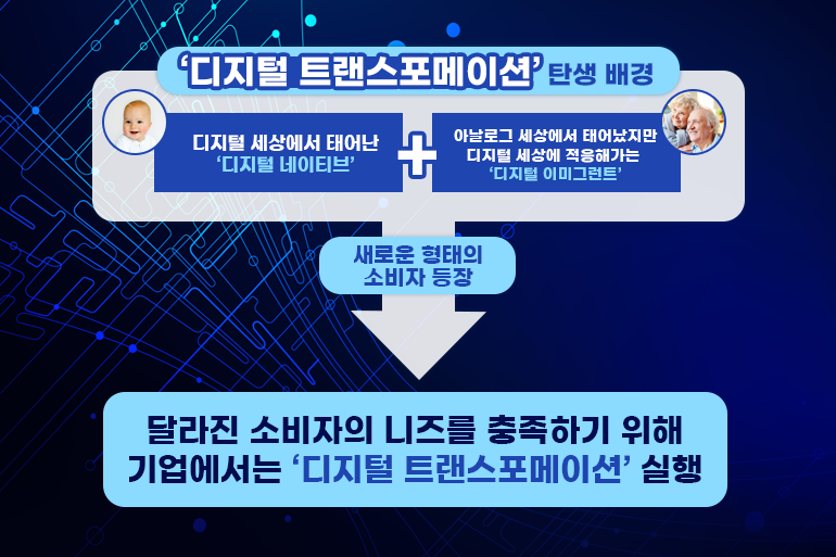 산업 전반에 걸쳐 ‘디지털 트랜스포메이션’이 일어나게 된 데는 소비자의 삶의 방식, 가치관의 변화 등이 가장 큰 이유로 손꼽히는데요. 처음부터 디지털 세상에서 태어난 ‘디지털 네이티브(디지털 원주민)’와 아날로그 세상에서 태어났지만 디지털 세상에 적응한 ‘디지털 이미그런트(디지털 이민자)가 공존하는 세상에서 기업은 더 이상 전통적인 방식을 고수하기 어려워졌어요. 따라서 기업들은 소비자들의 요구에 맞춰 자연스럽게 온라인에 초점을 맞춘 ‘디지털 트랜스포메이션’을 실행하게 된 것이죠.