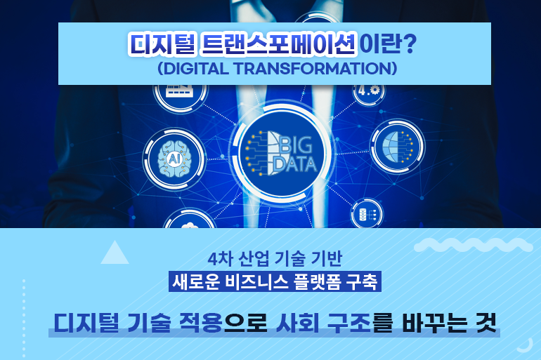 코로나가 확산된 지 어느새 1년, 우리의 일상에는 많은 변화들이 찾아왔습니다. 특히 비대면 문화의 확산으로 원격 수업, 화상 회의, 온라인 플랫폼을 활용한 쇼핑 및 금융 거래 등이 자연스러운 일상이 되었죠. 덕분에 빅데이터, AI, 클라우드 컴퓨팅 등 4차 산업으로 불리는 첨단 디지털 기술은 급속도로 발전하고 있는 추세인데요. 이러한 변화를 두고 ‘디지털 트랜스포메이션’이라는 용어가 요즘 떠오르고 있습니다. 그렇다면 우리의 일상을 바꾸는 ‘디지털 트랜스포메이션’은 과연 무엇일까요?
