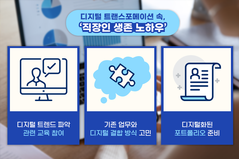 또한 AI 기술을 적용한 온라인 채용이 확대되는 만큼 자신의 실적이나 경력 등을 수치로 기록하고, 디지털화된 포트폴리오를 확보하는 것이 많은 도움이 될 거예요. ‘디지털 트랜스포메이션’이라는 급격한 변화가 오히려 모두에게 동등한 출발선을 만들어 주었기 때문에 더욱 신속하게 대응하고, 더 많은 디지털 역량을 키우는 이에게 많은 기회가 돌아갈 수 있겠죠?