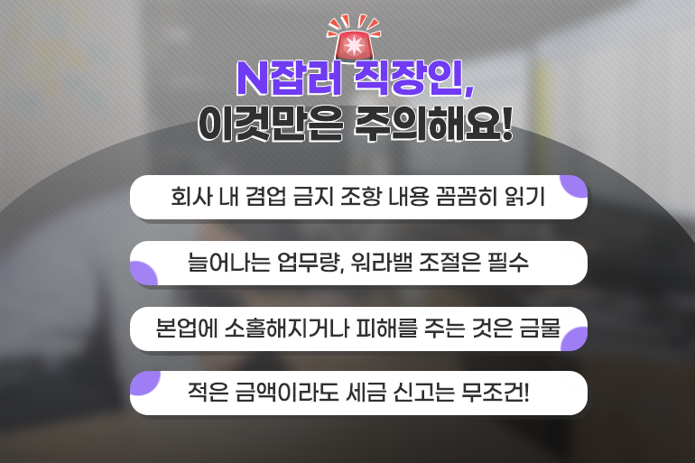 투잡을 통해 소득을 높이고, 자아를 실현할 수도 있으니 누구나 투잡, 쓰리잡을 시작해도 좋다? 그렇지 않아요! 자신의 직장 내규에 겸업 금지 의무 조항이 있다면 동종 업계에서 비슷한 직무를 수행할 경우 자칫 문제가 될 수 있어요. 또한 업무량이 늘어나 워라밸이 깨지면서 오히려 본업을 소홀하게 되고, 건강을 해치는 경우도 많기 때문에 적절한 균형과 안배가 필요하죠. 투잡을 통해 벌어들인 소득이라 해도 세금 신고를 제대로 하지 않으면 가산세로 인해 부담이 가중될 수 있으니 세금 신고도 잊지 말아야 합니다. 적은 금액이라도 급여를 받은 경우엔 국세청에서 관련 자료를 보유하고 있기 때문에 반드시 세금 신고를 진행해 주세요.