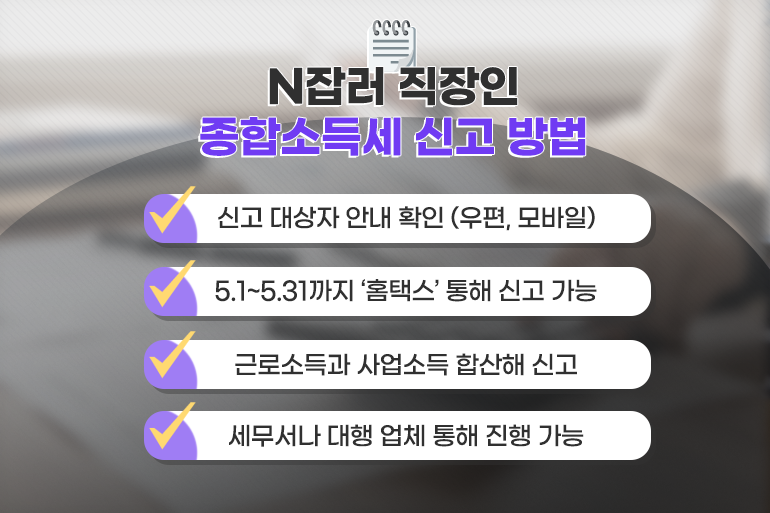 그렇다면 직장에서 발생한 근로소득 외에 추가로 발생한 수입의 경우 어떻게 세금 신고를 진행해야 할까요? 5월 한 달간 진행되는 종합소득세 신고 기간에 신고 대상자 본인이 경비, 소득공제 자료 등을 정리해서 국세청에 신고를 해주시면 돼요. 참고로 종합소득세란 개인에게 귀속되는 모든 소득을 합산하여 과산하는 제도이기 때문에 연말정산을 했더라도 근로소득과 사업소득을 합산해 신고를 해야 합니다.