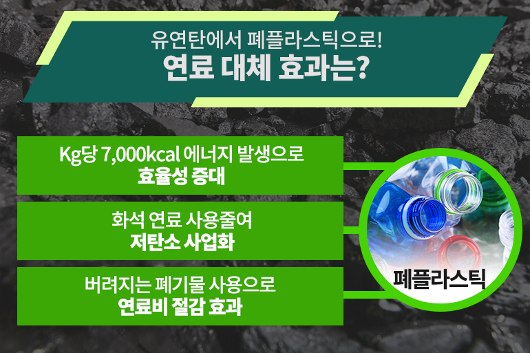 반면, 선진국의 경우 유연탄을 대신해 이미 폐플라스틱을 대체 연료로 사용하는 추세였어요. kg당 5000kcal의 열량을 발생시키는 유연탄에 비해 폐합성수지의 경우 kg당 7500kcal의 열량이 발생해 열원으로 활용하기에 훨씬 효과적이기 때문이죠. 게다가 유연탄 사용이 줄면서 탄소 배출도 줄어들고, 버려지는 폐기물을 연료로 사용하다 보니 연료비까지 절감할 수 있어 폐플라스틱이 친환경적이고, 경제적인 연료로 재평가받게 되었어요.