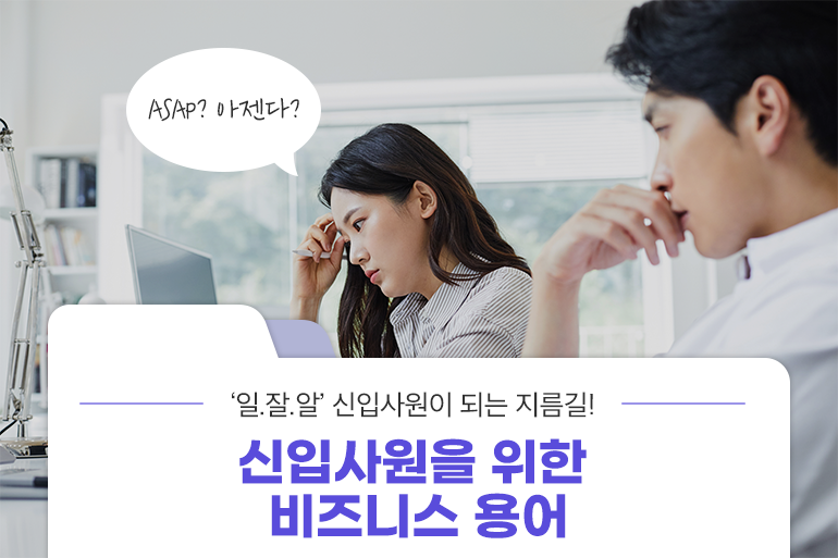 처음 사회생활을 시작하는 신입사원들에게 정신없이 흘러가는 회사에서의 하루는 그야말로 ‘멘붕’의 연속일 텐데요. 낯선 환경에 적응하고, 새로운 업무를 배우다 보면 궁금한 것이 차고 넘치지만 바쁜 선배들에게 일일이 질문을 하기는 쉽지 않습니다. 게다가 업무 관련 회의나 이메일을 주고받을 때마다 등장하는 생소한 용어는 10대들의 줄임말만큼이나 우리를 당황스럽게 만들죠. 그렇다면, ‘일.알.못’에서 ‘일.잘.알’ 신입사원으로의 업그레이드를 꿈꾸는 신입사원들을 위해 알아두면 매우 유용한 비즈니스 용어들을 살펴볼까요?
