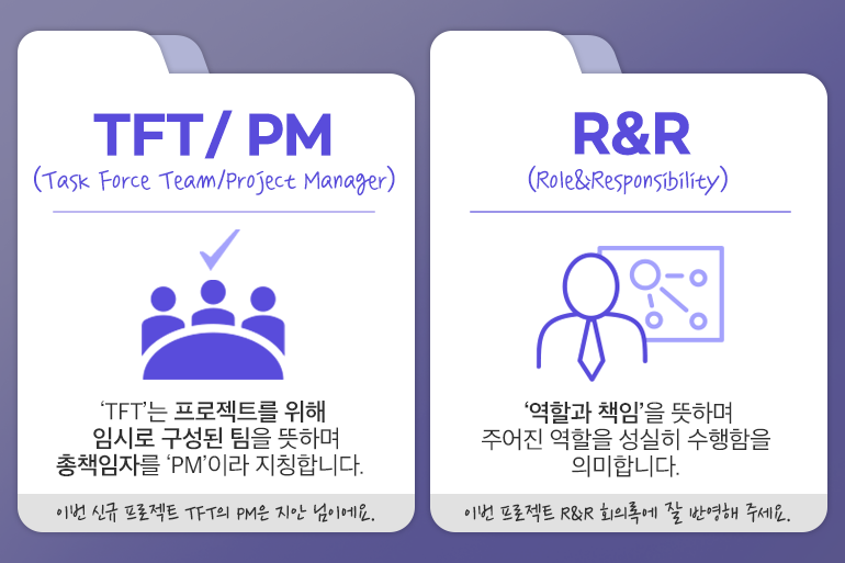 각자가 맡은 기본적인 업무 외에도 팀 차원에서 혹은 회사 차원에서 진행하는 새로운 프로젝트를 맡게 되는 경우가 있죠. ‘TFT(Task Force Team)’는 이러한 프로젝트를 위해 임시로 꾸려진 팀을 지칭하는 말로, 주로 각 부서에서 프로젝트 진행에 필요한 사람을 뽑아 TF팀을 이루게 됩니다. 그리고 프로젝트 진행 전반을 책임지는 사람을 ‘PM(Project Manager)’라고 부르죠.
