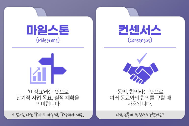 프로젝트 외에도 팀을 꾸려 협업을 하는 경우 ‘R&R(Role&Responsibility)을 지키라’는 표현을 자주 듣게 되는데요. R&R이란 역할과 책임을 뜻하는 말로, 팀 내에서 자신에게 주어진 역할을 성실히 수행하라는 의미예요. 또한 ‘마일스톤’은 이정표를 뜻하는 단어로 단기적 실적 목표나 사업 계획을 의미하며, 프로젝트 진행 시 특기할만한 사건(계약, 보고, 종료 등)을 뜻하기도 합니다. 협업 시에는 동료들의 합의를 이끌어 내야할 때가 있는데요. '컨센서스(Consensus)'는 동의, 합의라는 뜻으로 '컨센서스 구했어?'라는 뜻은 '담당자와 합의를 봤어?'라는 의미로 쓰입니다.