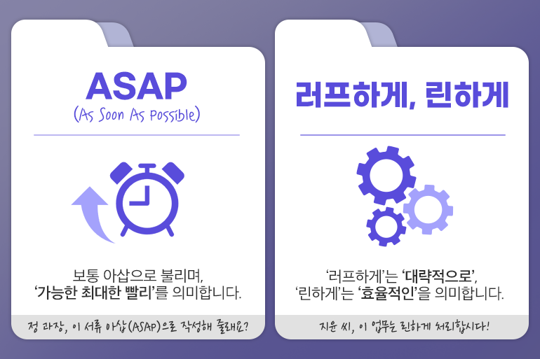 동시에 여러가지 업무를 요청받을 때 어떤 것을 우선순위로 해결해야 할지, 또 얼마나 꼼꼼하게 준비해야 할지 몰라 난감한 경우가 많은데요. 만약 업무 요청 사항에 ‘A.S.A.P’라는 말이 붙어 있다면 이 업무를 최우선 순위로 처리하는 것이 바람직합니다. ‘A.S.A.P’란 As Soon As Possible의 약자로 ‘가능한 최대한 빨리’를 뜻하며, 아삽, 에셉, 에이셉 등으로 불리기도 한답니다.