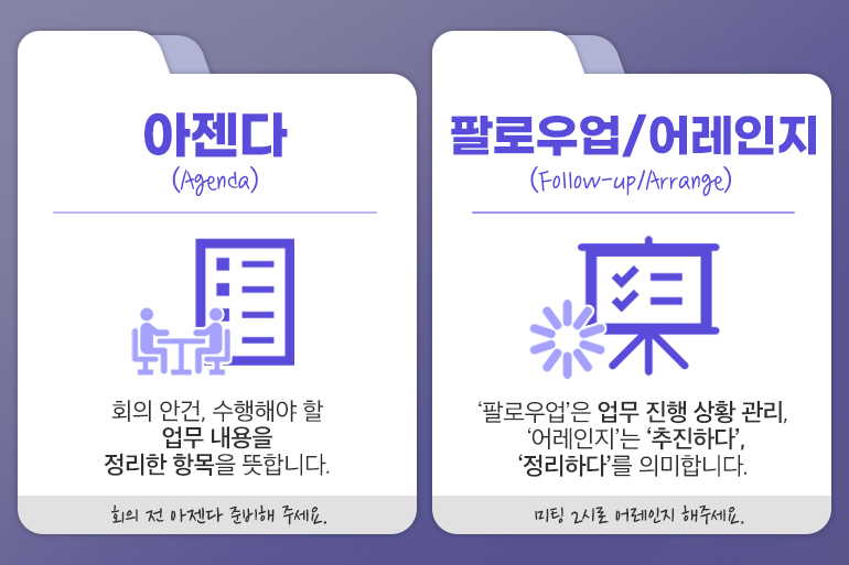 회사 생활의 절반은 미팅과 회의를 하며 보낸다 해도 과언이 아닐 텐데요. 회의를 준비하거나 진행할 때 주로 듣게 되는 용어들은 미리 파악하지 않으면 업무 수행에 큰 차질을 빚을 수 있어요! 우선 ‘아젠다’란 회의 안건, 수행해야 할 업무 내용을 정리한 항목을 뜻하는데요. 회의 전 아젠다를 준비하라는 지시가 있었다면 논의가 필요한 항목을 차례대로 정리해서 보고해 주시면 됩니다.